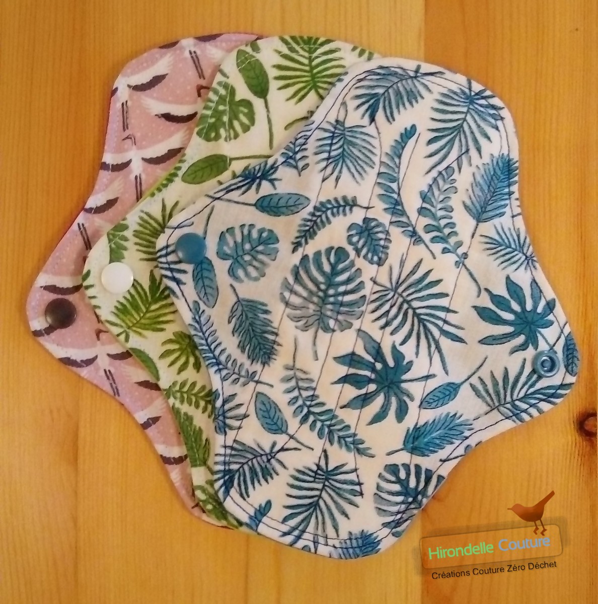 Serviettes hygiéniques lavables en coton à motifs (en contact avec le corps, coloris au choix) et éponge de bambou.